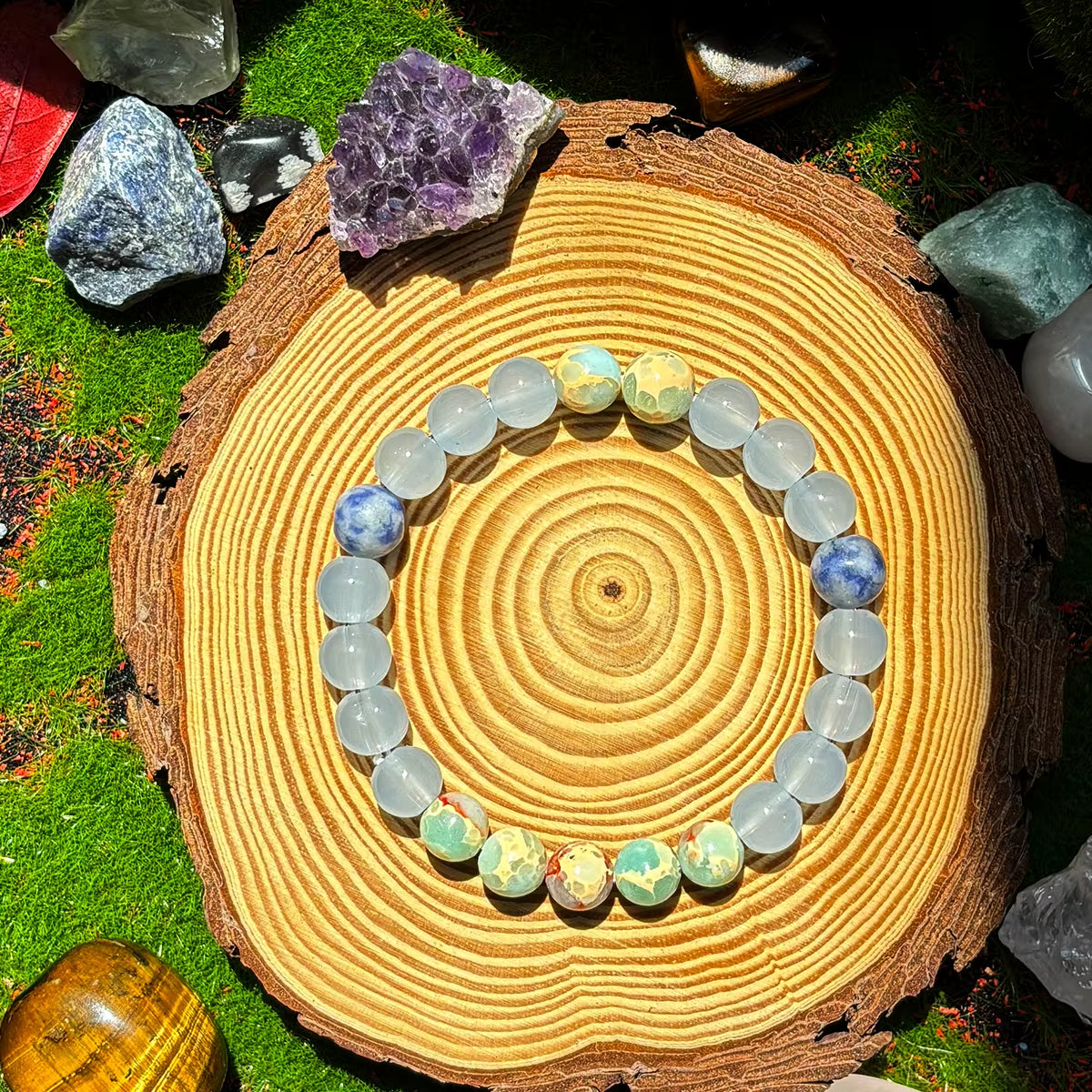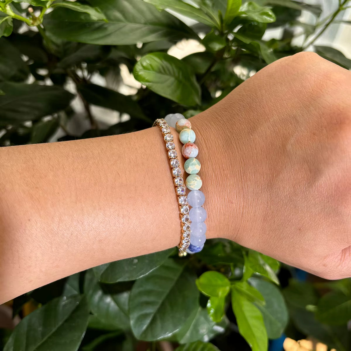 Ce bracelet perle mise sur la brillance douce et irrégulière de ses perles rondes translucides. Chaque perle est soigneusement polie, laissant apparaître la profondeur naturelle de l’amazonite dans toute sa subtilité. Ce rendu presque aquatique donne au bijou une texture visuelle unique, douce au regard et agréable au toucher. Le contraste entre les perles translucides et leur agencement régulier crée un équilibre apaisant, pour un effet élégant et discret à chaque instant.