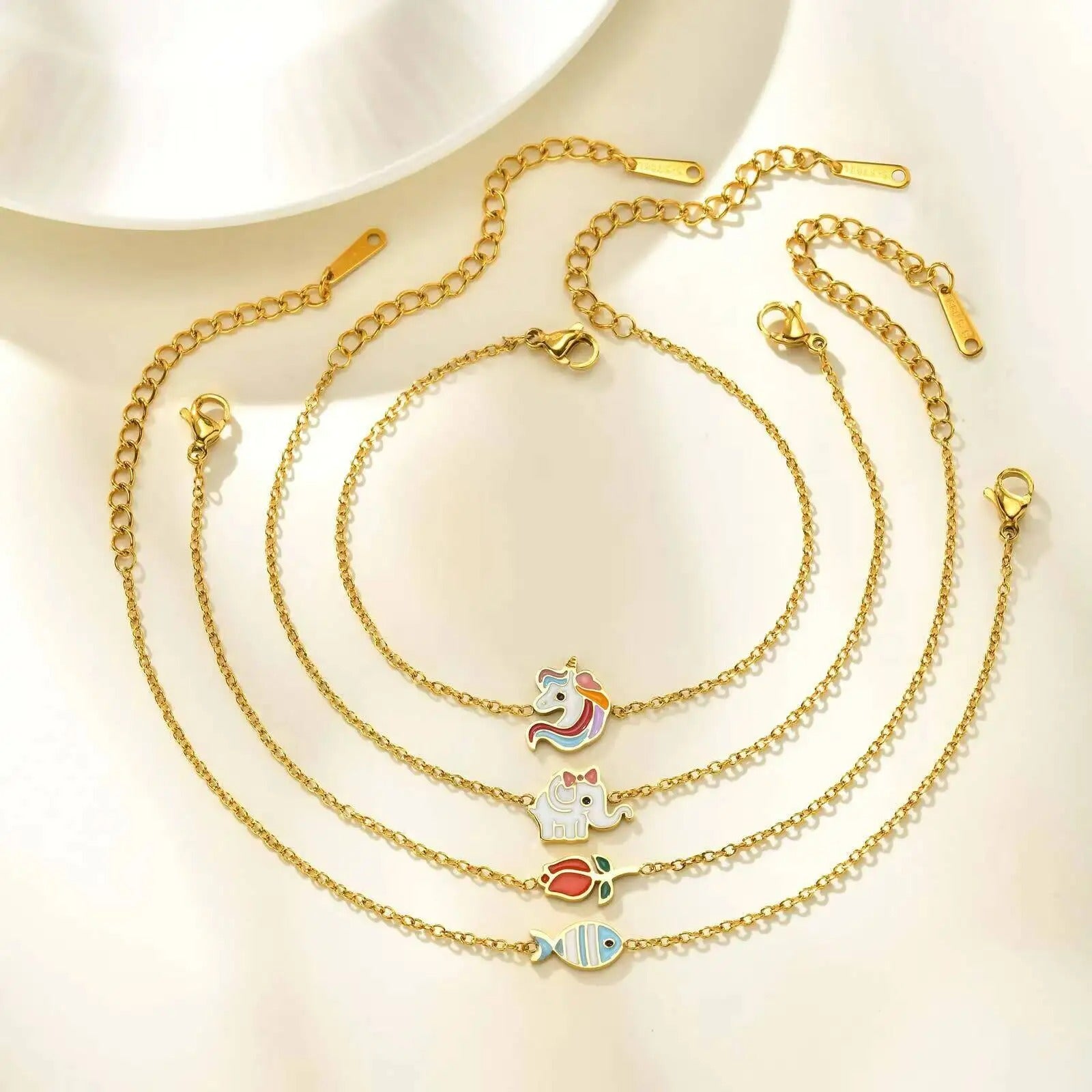 Ce bracelet bébé fille évoque la tendresse d’une rose offerte. Son motif coloré, délicatement émaillé, s’accorde à une chaîne dorée fine et légère. Réalisé en acier inoxydable, il allie douceur et solidité. Ajustable, sûr, il devient un petit geste d’amour à fleur de peau.