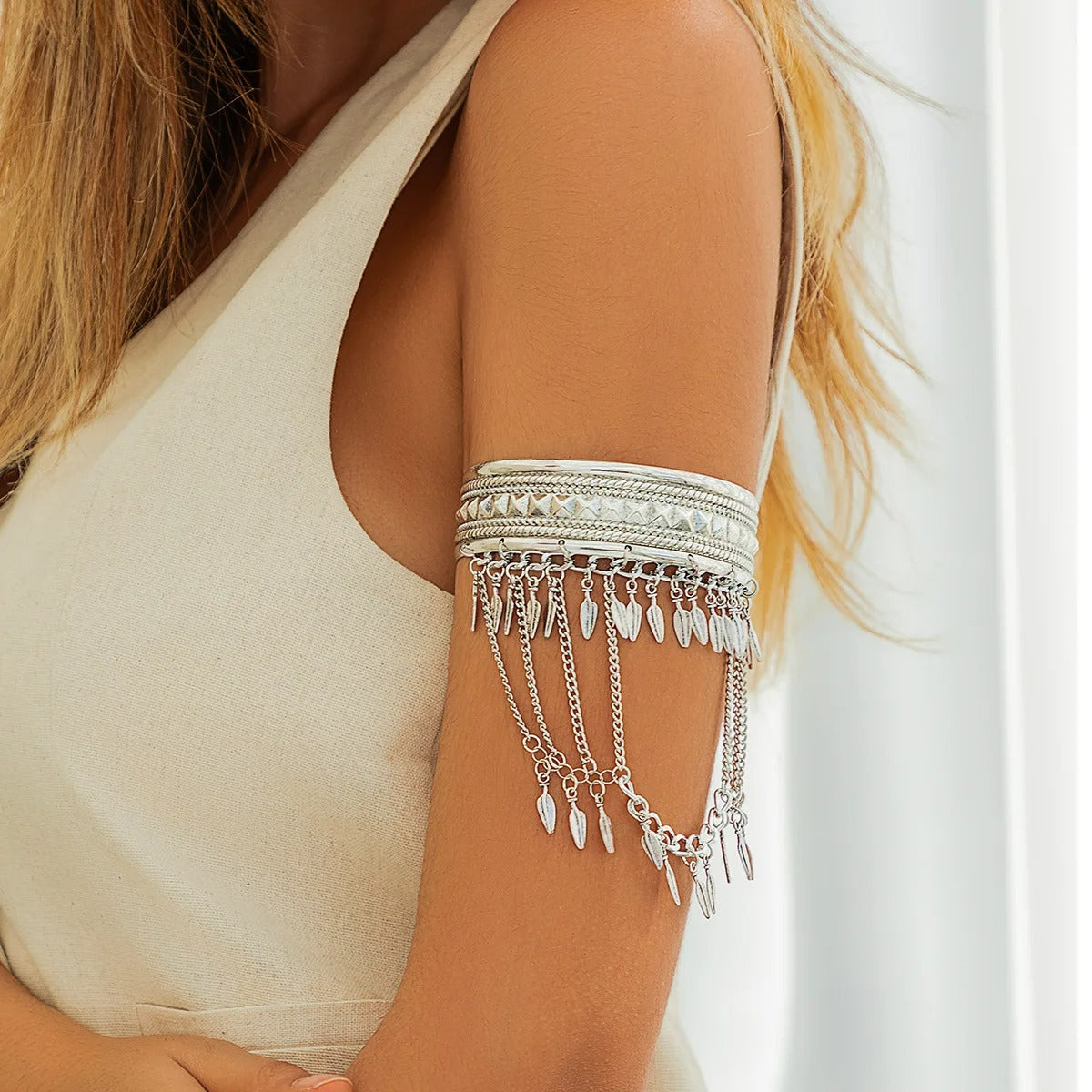 Avec ses chaînes mobiles, ses détails ciselés et son éclat boho-chic, ce bracelet de bras femme style hippie incarne la liberté en mouvement. Un bracelet de bras femme qui danse sur la peau, évoque les voyages intérieurs, les étés infinis, les silences habités.