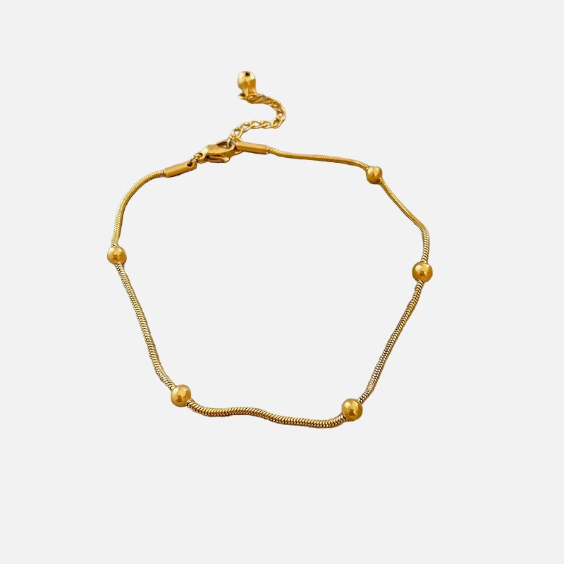 Le bracelet cheville femme chic en acier inoxydable allie légèreté et raffinement avec sa chaîne dorée fine, ponctuée de quatre perles placées avec équilibre. Ce bijou minimaliste brille sans exagération, captant subtilement la lumière à chaque pas. Ce bracelet cheville femme sublime la cheville avec délicatesse.