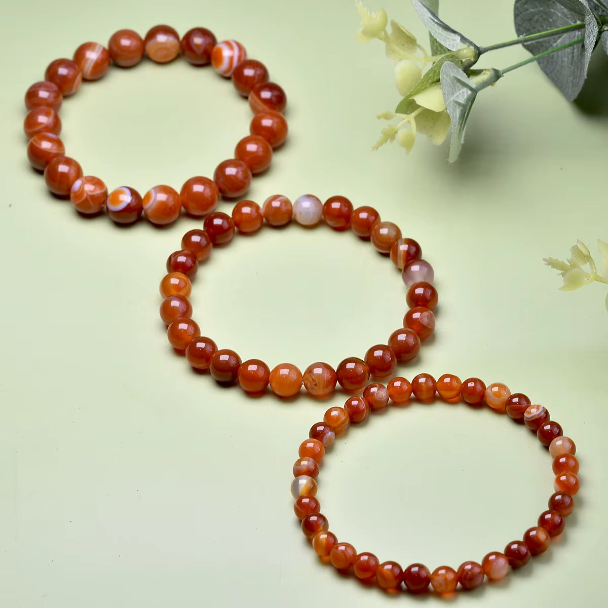 Ce bracelet déploie une palette chaleureuse allant du rouge brique à l’orange doux, avec des reflets légèrement dorés. Facile à associer à des tons neutres ou chauds, il réveille les tenues sobres et s’intègre parfaitement aux looks naturels. La cornaline joue ici le rôle d’un accent solaire, capable de réchauffer le style sans le dominer. Un rouge vivant, naturel, toujours flatteur.