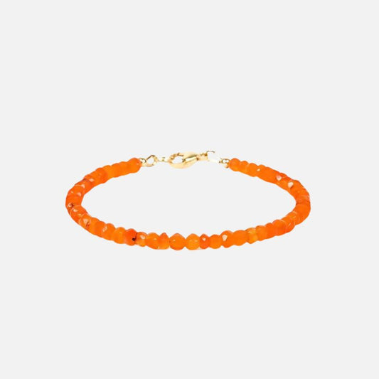 Ce bracelet perle valorise la pierre avec une sobriété raffinée. Trois perles rondes de cornaline sont centrées sur le bracelet, laissant la corde nue de chaque côté. Ce contraste subtil met en valeur l’intensité de la pierre rouge-orange, sans surcharge. Chaque perle, unique par ses nuances, capte la lumière et semble presque vibrer au rythme des gestes.