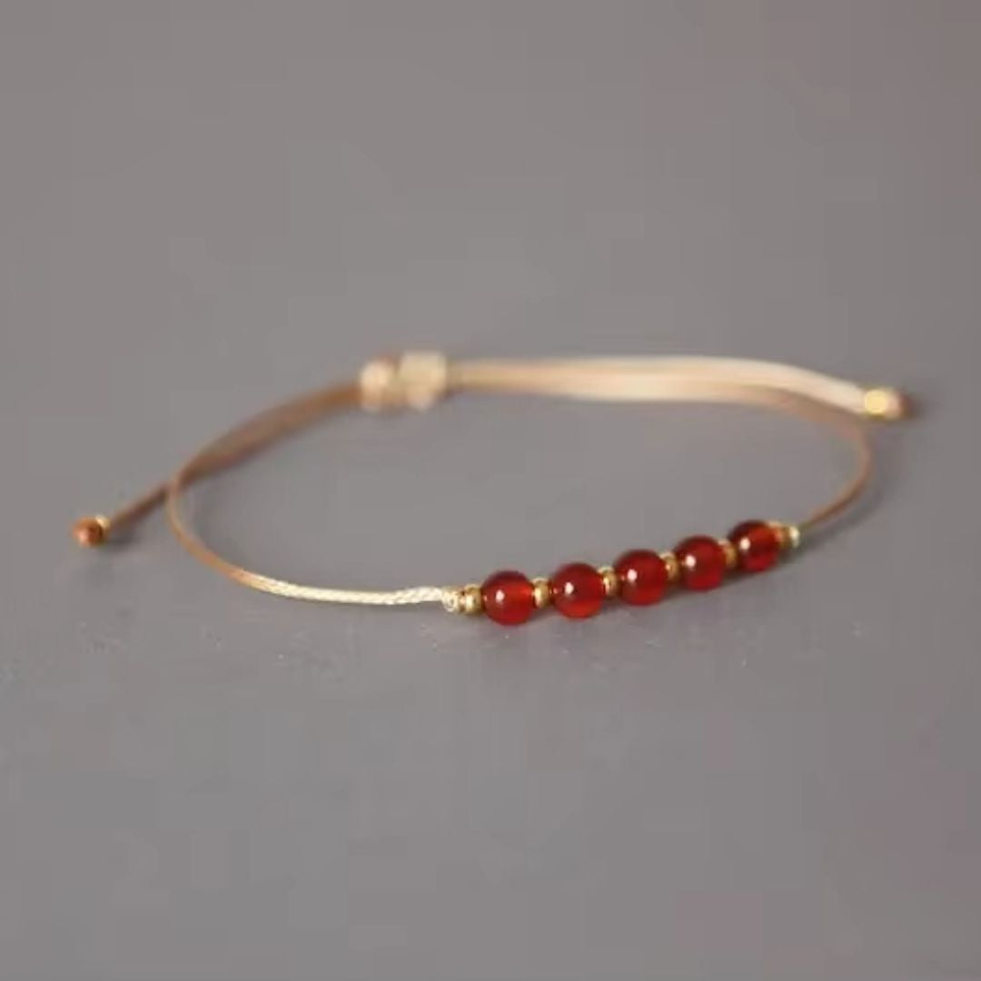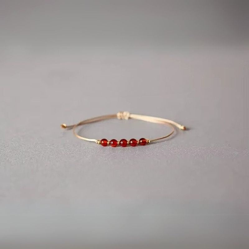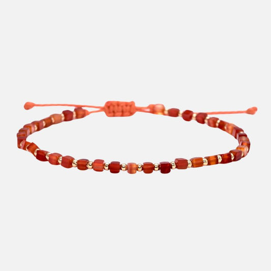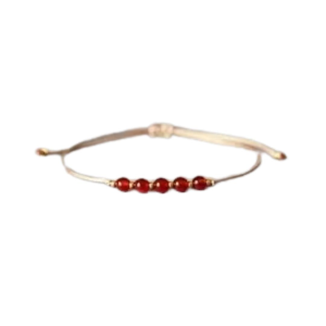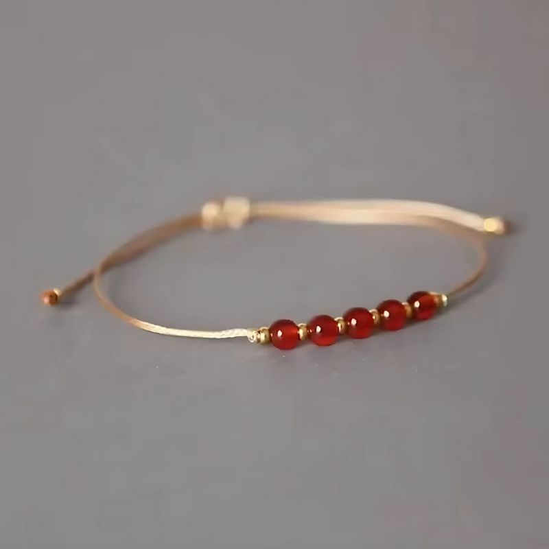 Le bracelet cornaline réglable marie finesse, souplesse et éclat naturel dans une création aussi belle que pratique. Ce bracelet cornaline parfait combine une corde tressée à un système de nœud coulissant, rehaussé de cinq perles en cornaline d’un rouge profond.
