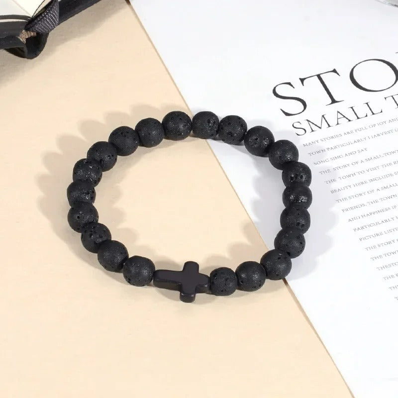 Ce bracelet croix homme marie matière brute et symbole fort. Les perles de lave naturelle, noires et poreuses, évoquent la terre, la force tranquille. Au centre, une croix noire mate attire l’œil sans éclat. Pour celles qui cherchent un bijou qui dit l’essentiel avec silence, profondeur et intensité.