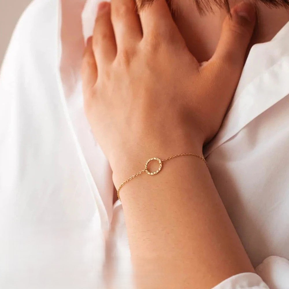 Ce bracelet fin femme acier inoxydable et cercle joue la carte du symbole discret. Le cercle martelé capte la lumière comme une promesse suspendue. Léger, résistant, infiniment doux sur la peau, ce bracelet fin femme s’adresse à celles qui aiment les bijoux silencieux qui disent beaucoup.