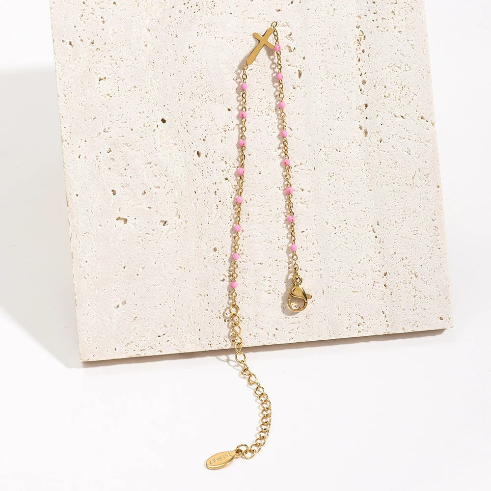 Ce bracelet fin femme croix acier inoxydable joue la carte de l’épure symbolique. Une chaîne dorée délicate, ponctuée de perles roses, et au centre, une croix dorée comme ancrage lumineux. Un bracelet fin femme pensé pour celles qui veulent porter un signe, sans jamais en perdre la grâce.