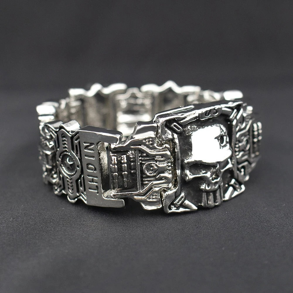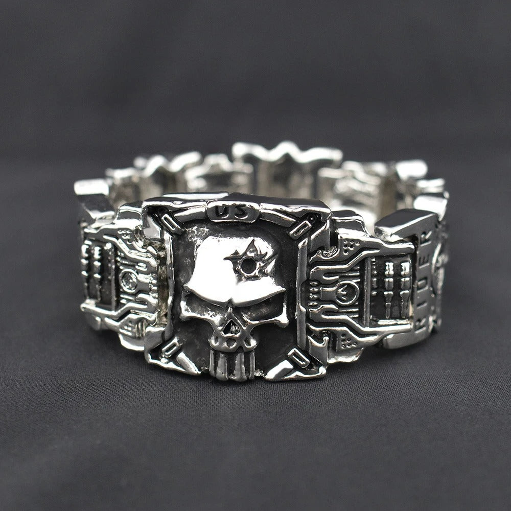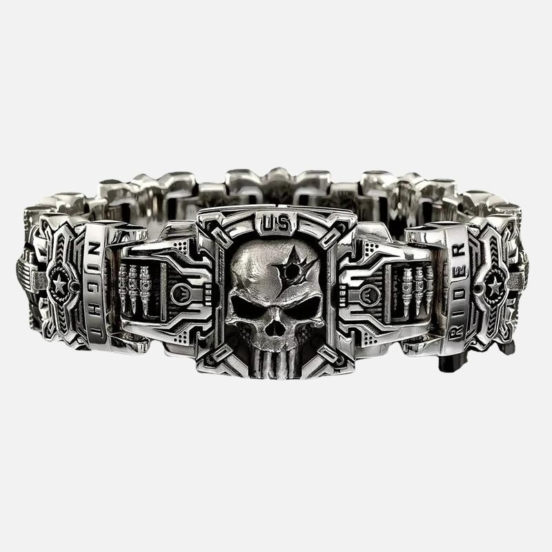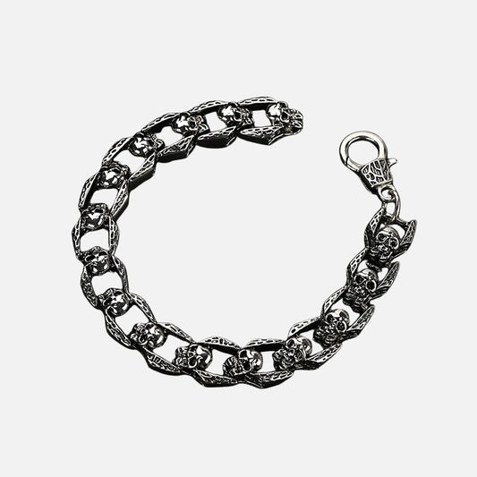 Assemblé avec un soin millimétré, ce bracelet homme combine technicité et caractère. Les crânes s’unissent dans une chorégraphie métallique qui capte la lumière et défie les regards. Il ne se contente pas d’orner, il impose une présence, sculptant l’espace autour de celui qui le porte avec assurance et liberté créative.