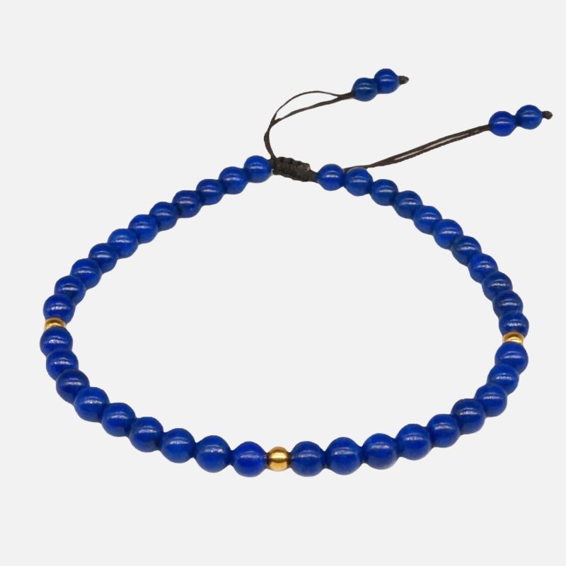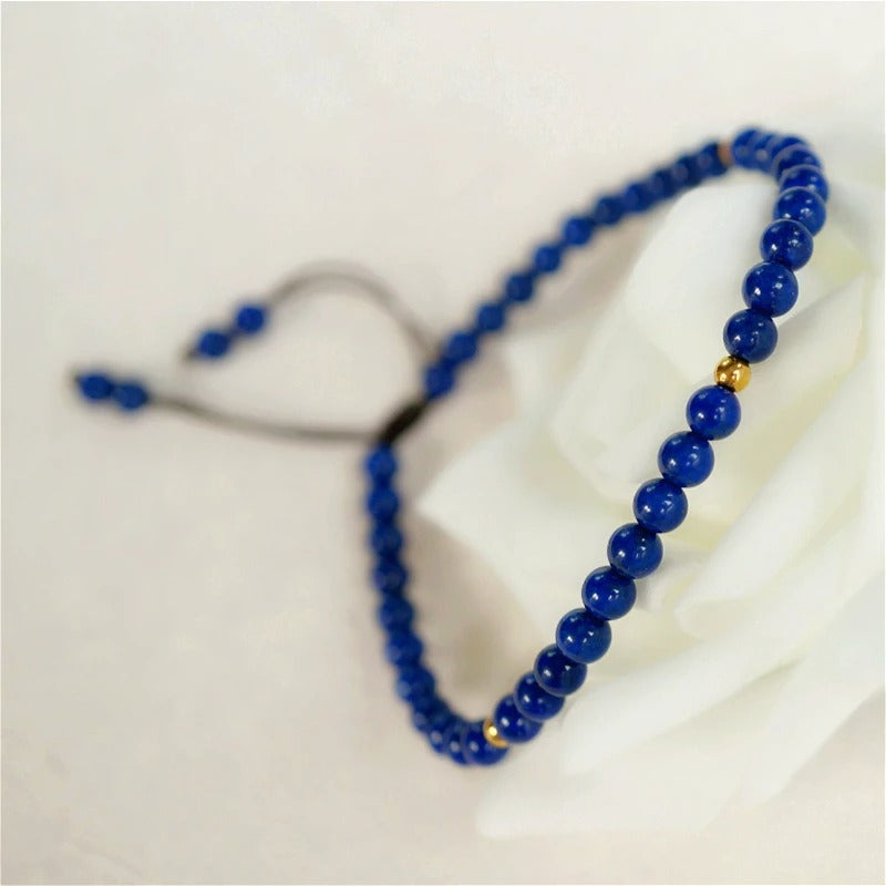 Ce bracelet pierre bleu évoque la paix intérieure et la vérité. Le lapis lazuli, choisi pour sa teinte intense, agit comme un repère visuel et émotionnel. Offrir ce bijou, c’est offrir un équilibre entre puissance tranquille et lumière intérieure.