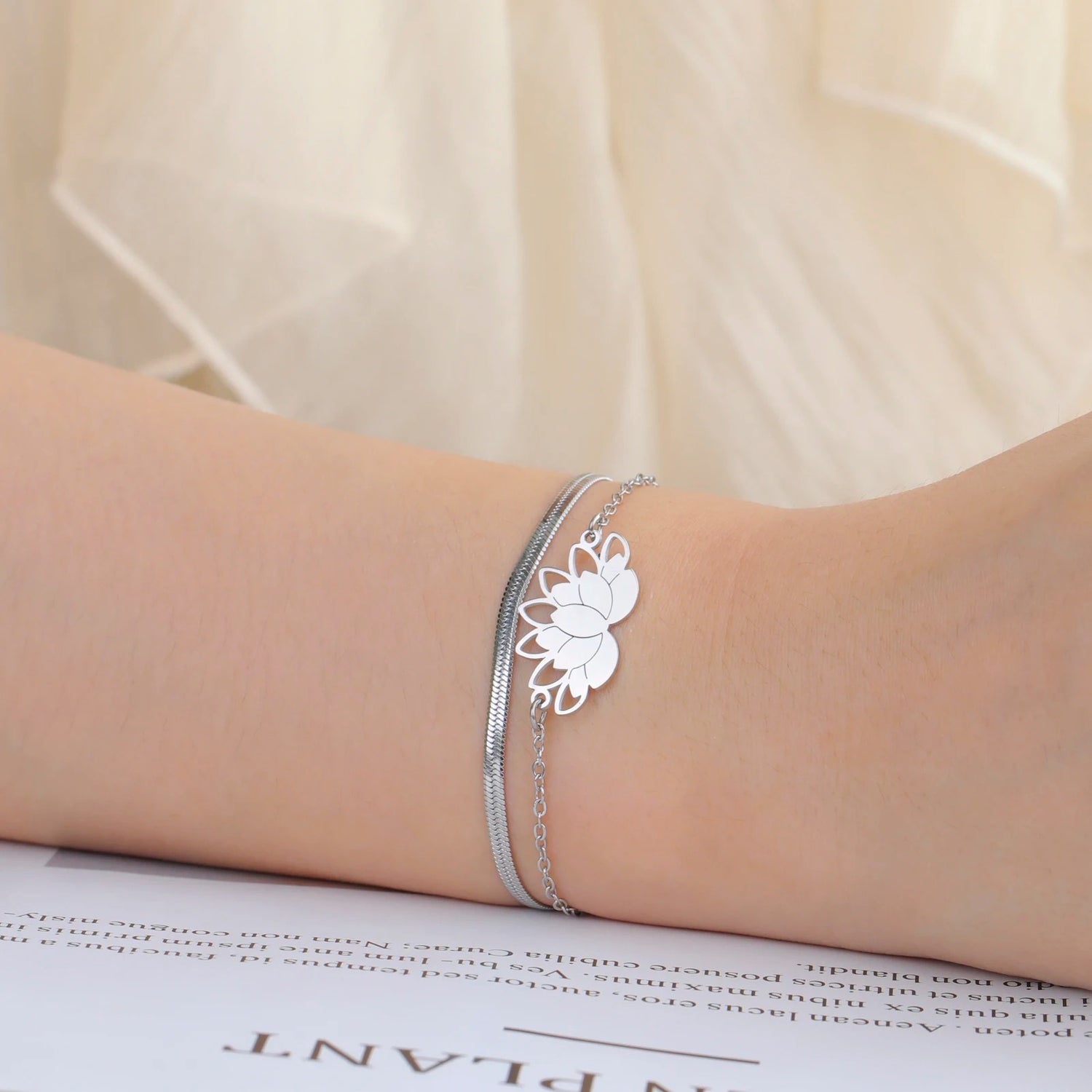 Bracelet Lotus Femme Double Chaîne Acier Inoxydable