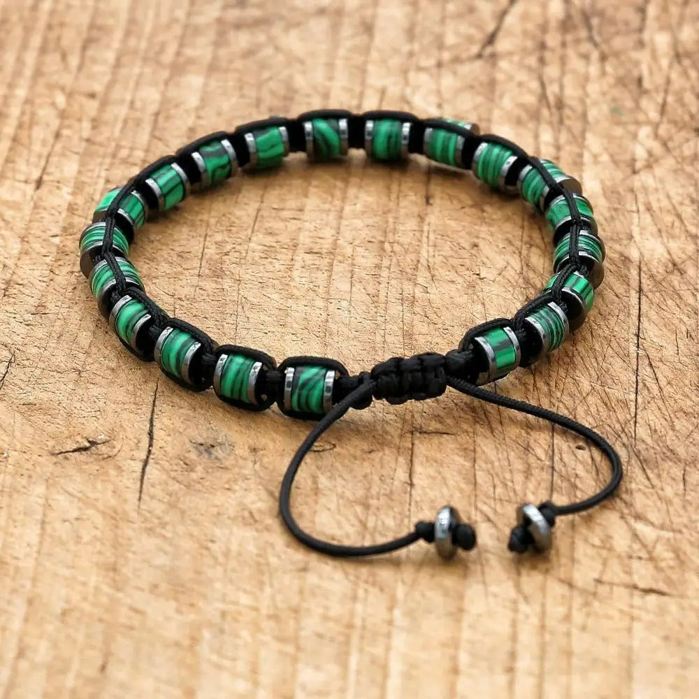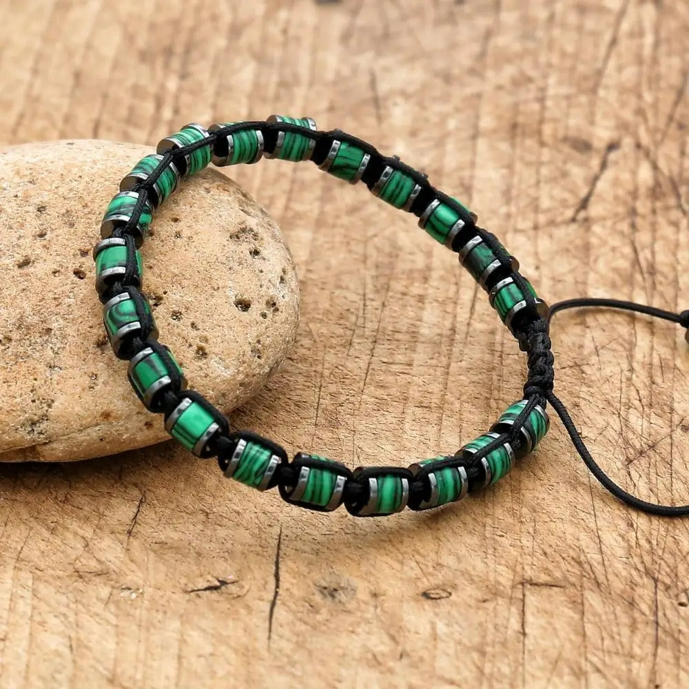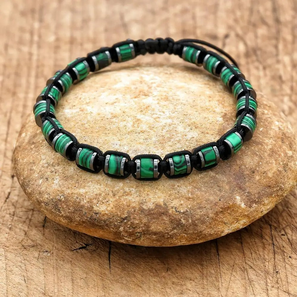 Porter un bracelet malachite, c’est faire le choix d’un bijou vivant, façonné avec patience. Ce bracelet malachite tissé à la main révèle toute la richesse de la pierre striée, mêlée au noir profond du tressage artisanal. Chaque pièce est une alliance rare de matière naturelle et de geste humain.