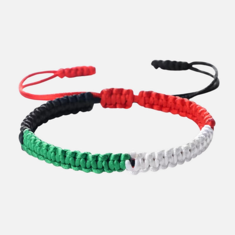 Le bracelet Palestine en corde associe un tressage en coton à l’intensité des couleurs du drapeau palestinien. La structure reste souple, légère et bien ajustée grâce à un montage manuel précis. Ce bracelet Palestine mise sur la sobriété du coton pour faire ressortir un symbole fort.