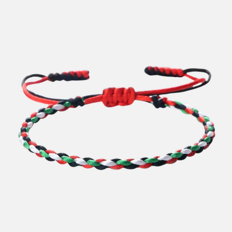 Le bracelet Palestine tressé associe des fils de coton entrelacés aux couleurs du drapeau palestinien dans un motif noué régulier. Ce bracelet Palestine est à la fois affirmé et discret, grâce à un équilibre parfait entre teintes vives et matière douce.