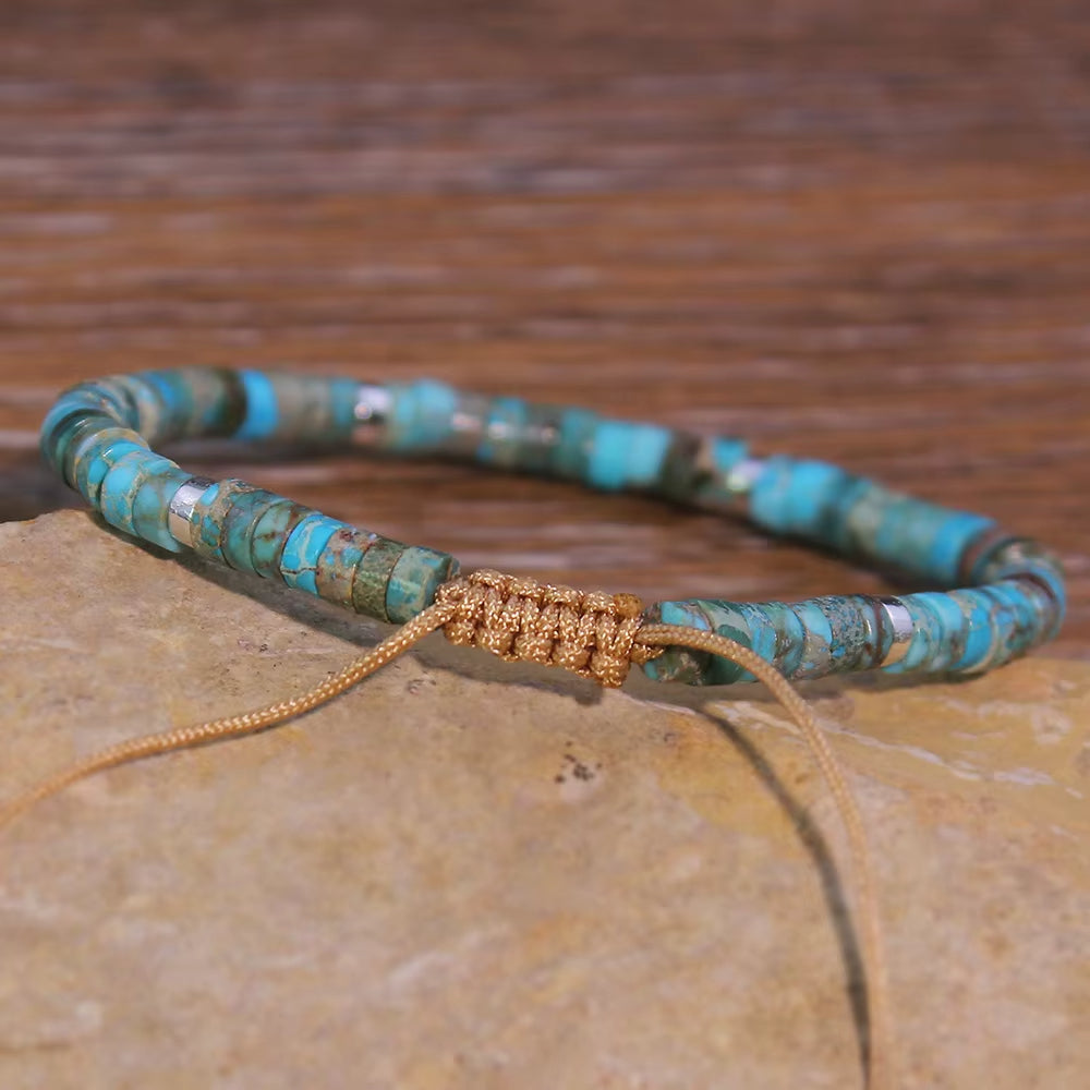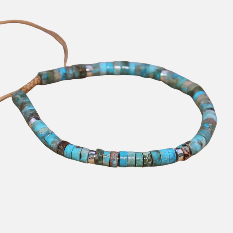 Ce bracelet perle met en avant une pierre chargée d’histoire et de symbolisme. Chaque perle en turquoise est légèrement différente, ce qui donne au bijou une touche artisanale et vivante. Le style ethnique discret permet de le porter avec de nombreuses tenues, du plus simple au plus travaillé. Son équilibre entre teinte forte et finesse des perles en fait une pièce unique.